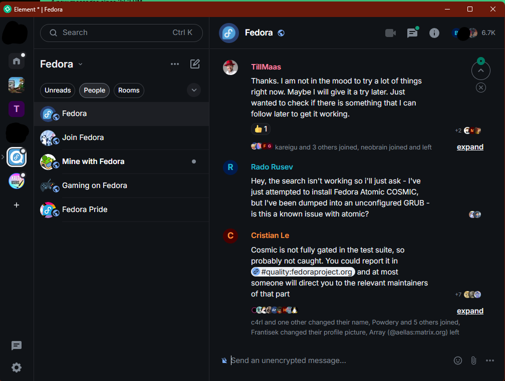 As to be expected, the main Matrix client, Element, isn’t that great. Instead of servers, Element uses spaces, which are similar, but different. So you have standalone rooms, and spaces, but accessing the spaces can be pretty confusing. Unlike Discord, Matrix does not have voice chats, however it does have calling, which I guess works in a pinch. I don’t think there is any streaming on Matrix, however. Element also feels pretty slow, even on my main PC on Windows, it struggles with scrolling, and it feels very choppy as fuck when scrolling. Meanwhile, on Linux, Element is only available as a Flatpak package on anything that isn’t Ubuntu or Debian. This would be fine, except that on the Flatpak version, it seems it cannot use the keyring on the OS, and by extension, would save messages in literal plaintext if you don’t do anything about it. So now you need to rummage though Github issue reports to find someone in the comments with the solution, which was allowing Flatpak access to the keyring for Element, which after that, it now works pretty decently.