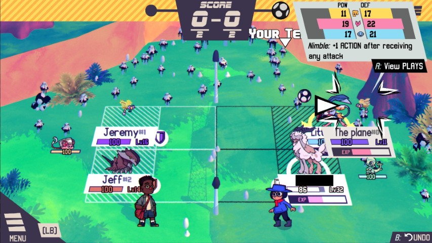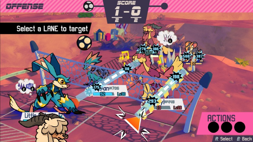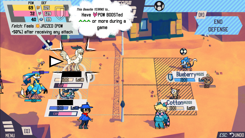 While attacking, you can do volleys that give your ally additional stats that may help you, you can also give certain effects to enemies so their attacks are less effective, there is also effects that affect the playing field itself (like an earthquake effect that damages the enemy team per turn, or spikes that damage those who are getting tagged in and out from the field). Certain beasties have traits, for example, there is this beastie I have called Fetcham who can catch the ball and allows them to immediately hit the ball without the need of volleying. There is another beastie called Illugus that places a spike effect that damages those who are tagged in, and there was another UFO looking motherfucker that has a tractor beam that prevents the beastie affected by it from moving.